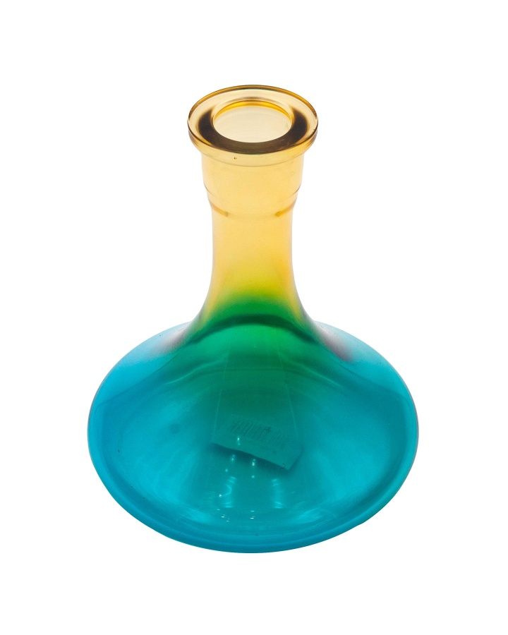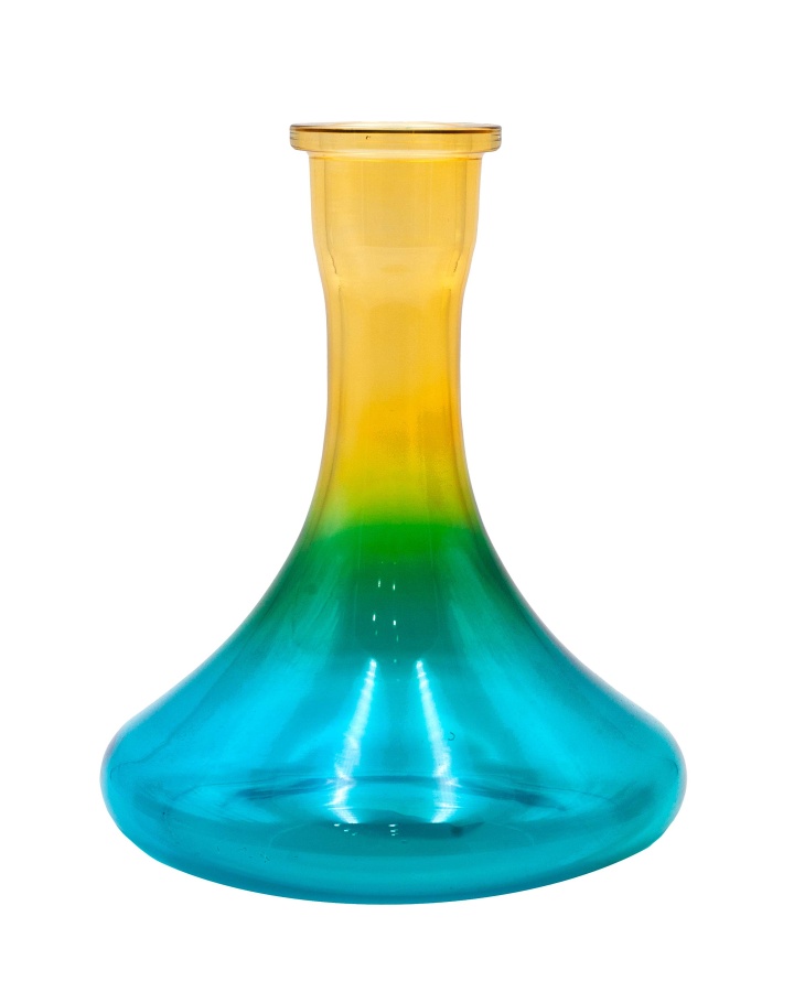Колба популярной и устойчивой формы "Пирамида" cо скругленными краями у основания дна. Выполнена из прозрачного стекла с напылением градиента желтого и синего цвета. Подойдёт под большинство современных кальянов.